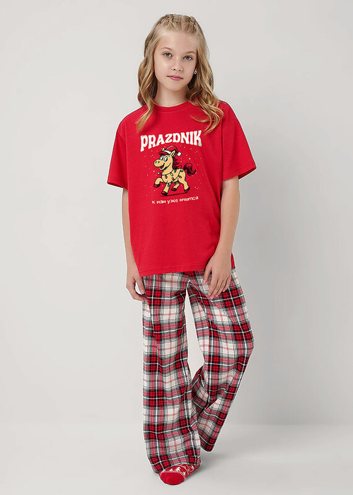 Новогодняя пижама для подростков,состоящая из футболки и брюк. Футболка свободного кроя спереди украшена милым тематическим принтом. Брюки прямые среднего объема с эластичным поясом.