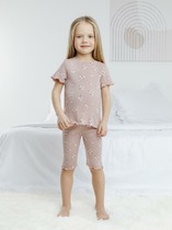 Трикотажная пижама из натурального хлопка. Футболка с короткими втачными рукавами изготовлена из эластичного трикотажа в рубчик. Брюки с эластичной резинкой в поясе выполнены из гладкого трикотажа супрем. Оригинальная набивка выполнена из стойких текстильных гипоаллергенных красителей. Изделие сохраняет цвет и форму после многократных стирок. Все трикотажные полотна производятся в соответсвии с нормами швейцарского сертификата ЭкоТекс.