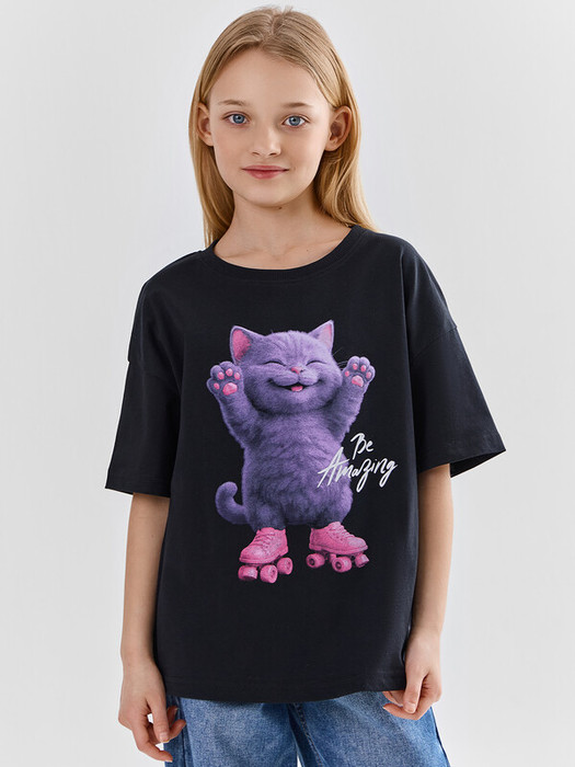 Футболка из трикотажного полотна кулирного переплетения. Силуэт свободный, длина до середины бедра. Рукава короткие, горловина круглая. Дизайн футболки наверняка понравится вашей моднице!