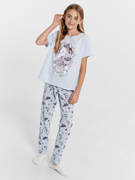 Уютная и красивая пижама для девочек. Выполнена из хлопковой трикотажной кулирки. В комплект входят футболка и брюки. Футболка с круглым вырезом, короткими рукавами. Свободный силуэт и классическая длина обеспечивают комфорт. Брюки длинные, слегка заужены к низу, с тесьмой в поясе. Широкий размерный и цветовой ряд. Комфортно и очень стильно!