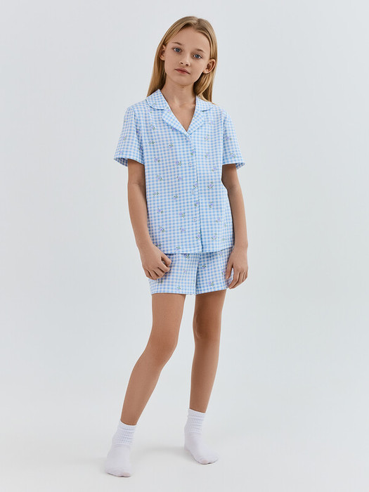 Комплект состоит из рубашки и шорт. Рубашка прямого силуэта, с отложным воротником, спинка цельнокроеная. Плечо слегка спущено. Рукав втачной, одношовный, короткий. Центральная застежка на пуговицы.