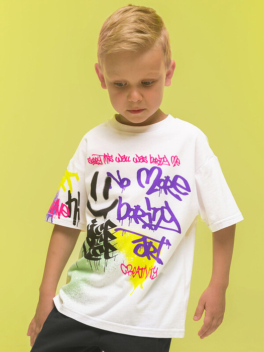 Детская футболка для мальчика. Комфортная майка свободного объёма не будет стеснять движений ребёнка. Джемпер с удлинёнными широкими рукавами — один из модных трендов сезона. Небольшой вырез горловины обработан широкой эластичной рибаной (ткань в рубчик) — она прекрасно держит форму, при этом ребёнку удобно надевать и снимать футболку. Изделие неприхотливо в уходе. Футболка с прикольным принтом в актуальном стиле граффити по переду и на левом рукаве. Надписи переводятся: «больше никакого скучного искусства», «извините, эта стена мне надоела, креативность», «приятный». Принты эластичные и прочные, не боятся частых стирок. В составе ткани 100% хлопка — майка мягкая, дышащая, приятная на ощупь. Футболка для мальчиков выполнена в белом цвете. Размерный ряд: 1 (86); 2 (92); 3 (98); 4 (104); 5 (110); 6 (116); 7 (122); 8 (128); 9 (134); 10 (140); 11 (146). Белая футболка оверсайз с принтом подходит как для маленьких мальчиков, так и для подростков. Её можно носить летом, осенью и весной (демисезон), зимой в качестве среднего слоя одежды. Подходит для детского сада, спорта, прогулок, отдыха, а также в качестве домашней одежды. Легко сочетается с различными брюками и шортами. Оверсайз-футболка для мальчика — отличный подарок сыну, внуку, брату или племяннику на любой праздник или просто в качестве знака внимания и заботы.