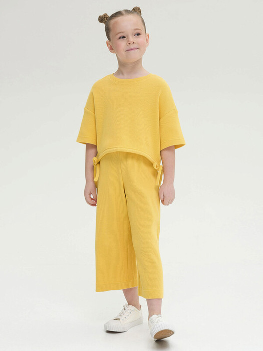 Брючный комплект кроп-топ и кюлоты для девочек. Безусловный хит сезона для юных модниц. Комплект из вафельного фактурного материала, который обеспечит комфортное и приятное ношение в самую жаркую погоду. Топ оверсайз с утяжками из основной ткани по низу, которые завязываются по бокам и создают легкий объем изделию. Широкие брюки прямого силуэта длиной 7/8 на резинке с внутренней утяжкой невероятно удобны. Данная модель не стесняет движения при ходьбе, свободно тянется, но при этом даже при постоянной носке не теряет форму. Идеальная детская одежда на все случаи жизни, от семейных походов по магазинам, до отдыха после школы и прогулок.