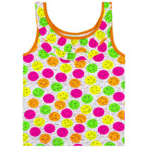 Летняя майка для мальчика свободного силуэта. Выполнена из 100% хлопка. Горловина из рибаны - голова не застрянет. По переду украшена ярким принтом с персонажем из игры Pac-man (пакмен) с надписями. Перевод надписей: "let's be creative" - будь креативный, "think bold" - думай смелее, "enjoy" - наслаждайся, "have fun" - веселись. Футболка без рукавов отлично подойдет для занятий спортом, походов на пляж и прогулок.