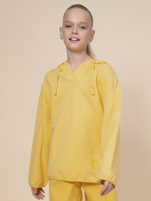 Стильное худи для девочки. Покорит сердца девочек современным дизайном, невероятно удобным кроем и уникальным внешним видом. Худи из хлопкового футера с петлей, мягким спущенным плечом. По низу изделия и рукавов эластичная окантовка. Удобная горловина в виде планки, без пуговиц. Капюшон с регулировкой шнурками, концы шнурков оформлены кисточками. Толстовка худи с принтом и рисунком, весь декор в тон. Худи для подростков свободного кроя впишется в детский гардероб и удивит своей комбинаторностью, с ним сочетаются любые подростковые вещи. Толстовка для малыша и подростка подойдет для прогулок весной и как милое, мягкое, яркое теплое худи для долгих вечеров с друзьями на лето. Не боится испытаний активными играми и частыми стирками. Прочная, тактильно приятная и безопасная для ребенка ткань очень износостойкая и надолго сохранит красивый внешний вид. Удлиненное худи подойдет как детская домашняя одежда для дома, для повседневной носки на каждый день, как весенняя и летняя объемная вещь. Изделие предствалено в желтом цвете. В линейке представлены следующие размеры:  1 (86);2 (92); 3 (98); 4 (104); 5 (110); 6 (116); 7 (122); 8 (128); 9 (134); 10 (140); 11 (146). Выбирайте нужный размер по таблице размеров на фото. Цвет товара на экране вашего устройства может отличаться от цвета изделия вживую.