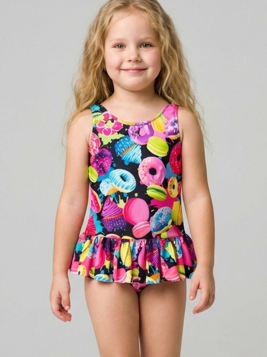 Яркий детский слитный купальник для девочки. Модель с удобными широкими бретелями и декоративной оборкой на талии. На спинке — красивый глубокий вырез с резинкой. Весь купальник украшен красочным принтом с изображением сладостей — капкейков, макаронов и пончиков на черном фоне. Обработка выполнена мягкой резинкой, внутри есть подкладка и гигиеническая наклейка. Подходит для пляжа и бассейна.