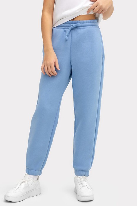 Брюки изготовлены из трикотажного полотна футер. Брюки свободного силуэта. Сиденье немного спущено. В боковых швах обработаны карманы. Подкладка карманов из кулирки. Пояс отрезной с эластичной тесьмой внутри. В передней части с лицевой стороны пробиты петли и втянут шнур. Низ брюк обработан в подгибку с эластичной тесьмой внутри.