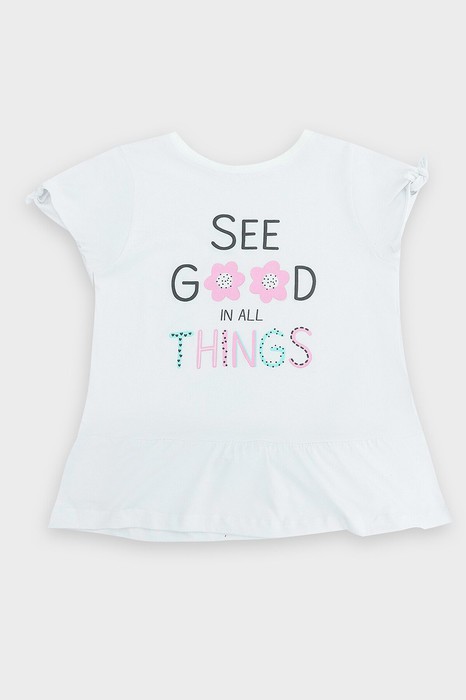 Джемпер выполнен из полотна кулирного переплетения 100% хлопок, 160 г/м2. Джемпер расширенного силуэта, длиной ниже середины ягодиц. Перед и спинка с отрезной рюшей по низу. Горловина круглой формы. Обработана обтачкой из основного полотна. Шов притачивания обтачки по спинке распошит. Рукава короткие, с разрезом по центру и завязками. Низ джемпера обработан швом в подгибку.