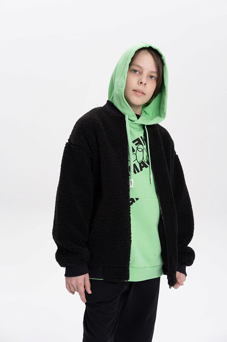 Трикотажный бомбер из бербер-флиса. Такой флис еще называют тедди, барашек. Мягкая кофта оверсайз застегивается на молнию. По переду два глубоких прорезных кармана. Воротник, манжеты рукавов и манжет низа выполнены из декоративной рибаны. Плюшевая толстовка из искусственного меха утеплена флисовым подкладом, благодаря чему ее можно носить в прохладную погоду весной и осенью. Универсальные цвета подойдут для повседневной носки в школу и на прогулку. Широкая размерная линейка подойдет как малышам так и подросткам.