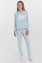 Уютный комплект для девочек, состоящий из джемпера с длинными рукавами и брюк. Джемпер свободного силуэта. Перед и спинка цельнокроеные. Горловина круглой формы из основного полотна. Рукава втачные, низ рукавов с притачными манжетами. Брюки прямые, с притачными манжетами. Пояс с эластичной тесьмой, которая обеспечивает отличную посадку. Стильная и комфортная детская пижама — лучший вариант для прохладного времени года. Широкий размерный ряд, красивые расцветки моделей в линейке. Рекомендуем!