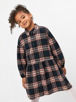 Платье свободного силуэта. Перед и спинка цельнокроеные. Горловина круглой формы c окантовкой из трикотажного полотна рибаны. В горловину втачан вязаный воротник, шов втачивания закрыт х/б тесьмой. Рукава длинные, втачные. Линия плеча спущена. По низу рукавов притачные манжеты из трикотажного полотна рибаны. Низ изделия фигурный, обработан на 2-х игольной плоскошовной машине швом в подгибку. Длина платья выше колена.