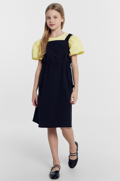 Платье для девочек свободного силуэта на бретелях. По спинке верхнего края платья внутри эластичная тесьма RV20. Платье отрезное по талии, с кулиской. В ней пробиты петли и протянута эластичная тесьма SFKR-1, с фиксаторами SFFKR-1, образуют сборку. По боковым швам накладные карманы с клапаном. Низ платья обработан швом вподгибку.