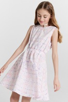 Платье для девочек свободного силуэта на бретелях. По спинке верхнего края платья внутри эластичная тесьма RV20. Платье отрезное по талии, с кулиской. В ней пробиты петли и протянута эластичная тесьма SFKR-1, с фиксаторами SFFKR-1, образуют сборку. По боковым швам накладные карманы с клапаном. Низ платья обработан швом вподгибку.