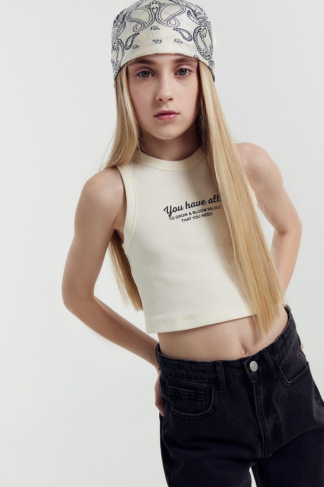 Топ для девочек прилегающего силуэта. Горловина круглая. Проймы и горловина окантованы бейкой из основного полотна. Низ изделия обработан швом в подгибку.