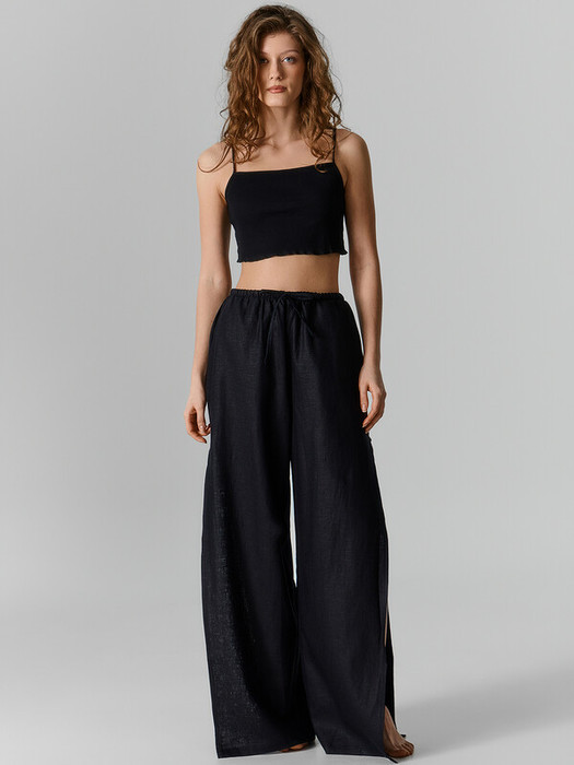Брюки с посадкой на талии свободного силуэта. Пояс цельнокроеный с резиной внутри. По центру пояса пробиты петли, протянута бейка из основного полотна. В боковых швах выполнены высокие разрезы. На передних деталях карманы "хулиганы". Низ изделия обработан швом в подгибку.