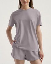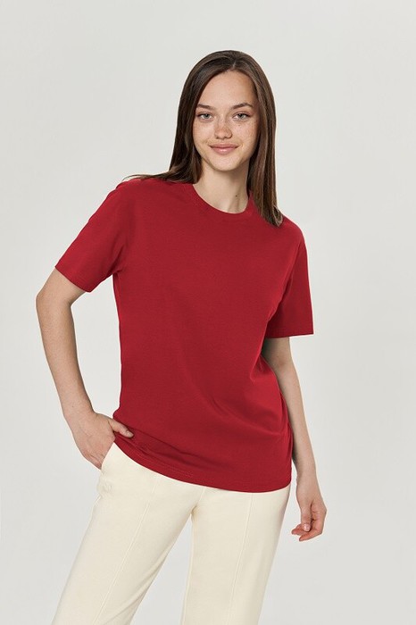 Boyfriend крой, круглый вырез. Втачной рукав. Горловина из рибаны. отстрочена по переду. Плечевые швы и шов горловины спинки укреплены бейкой из основной ткани.