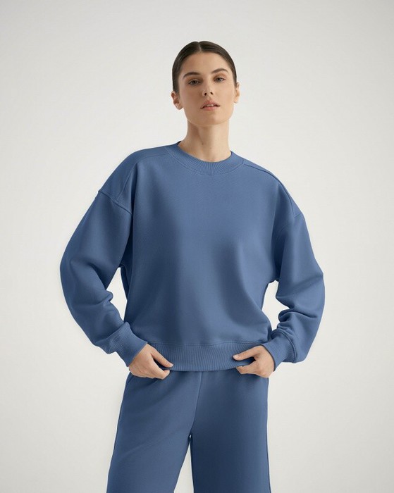 Свитшот женский с цельнокроенной кокеткой спинки. Втачной рукав с локтевым швом. Горловина с двумя швами. Пояс, манжеты, горловина из кашкорсе