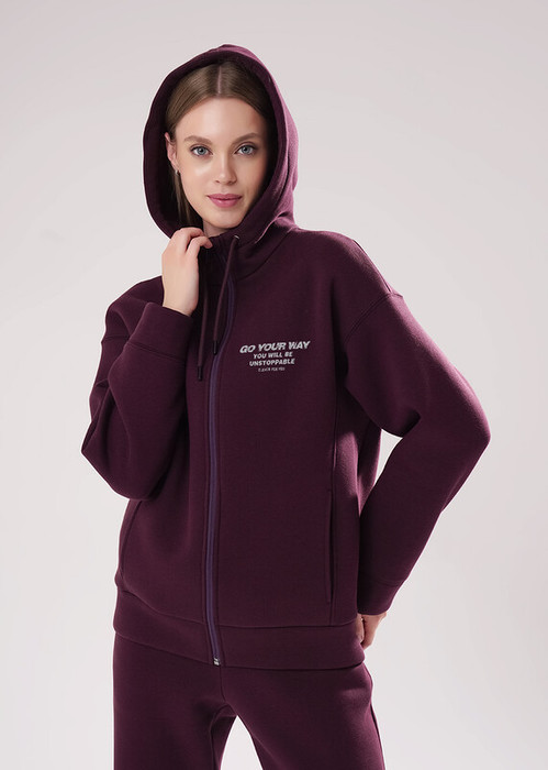 Куртка спортивная из трикотажного полотна футер с начесом, свободного кроя на молнии с капюшоном на подкладе и шнуром. Длинный рукав со спущенной линией плеча. По переду резы с карманами в швах. По низу рукава и изделия манжет. Спереди принт.