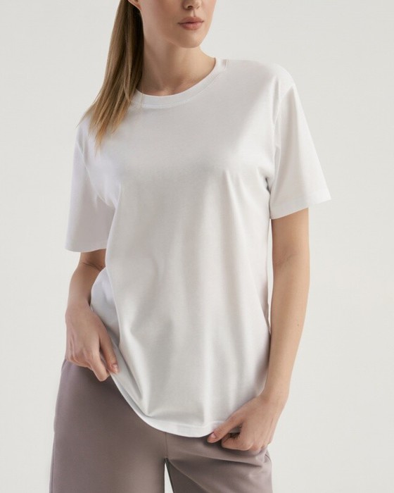 Boyfriend крой, укрепление по горловине спинки, круглый вырез. Горловина рибана. Отстрочка по горловине переда