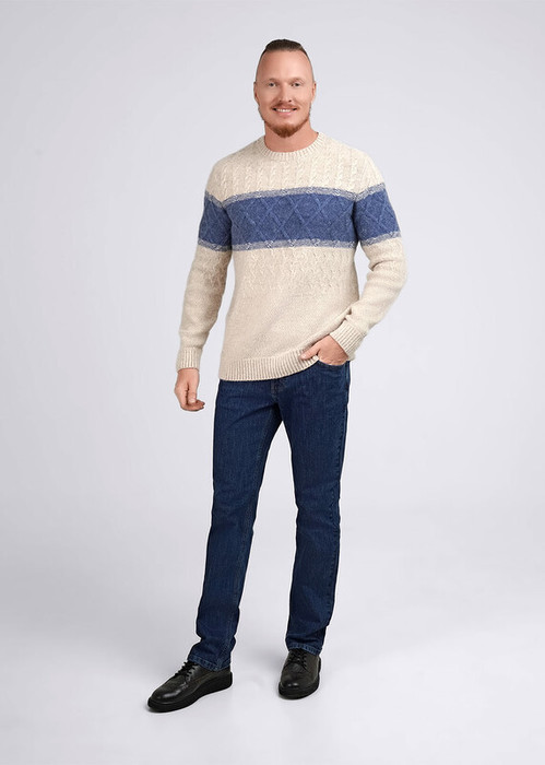 Мужской вязаный джемпер с круглым вырезом горловины и длинным рукавом. Джемпер с геометричным узором, выполнен из смесовой пряжи с добавлением шерсти. Данное изделие прекрасно сохраняет тепло. Можно скомбинировать с брюками или джинсами.