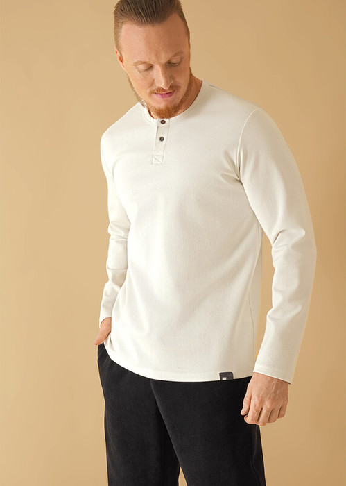 Лонгслив мужской с длинным рукавом, округлой горловиной и планкой, выполнен из фактурного трикотажного ""вафля"". Модель дополнена имиджевой фурнитурой. Прекрасно подойдёт для любого низа благодаря своей универсальности.