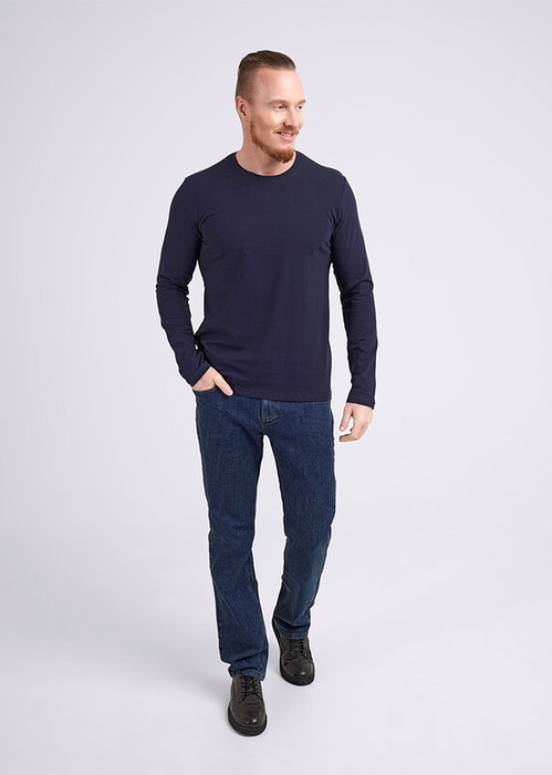 Джемпер прямого силуэта, длинный рукав, круглый вырез горловины обработан обтачкой. Изделие выполнено из натурального полотна с добавлением эластана для удобства ношения.
