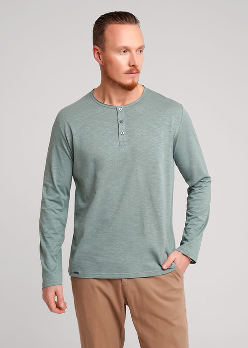 Лонгслив мужской с длинным рукавом, округлой необработанной горловиной на планке из фактурного полотна флам. Изделие дополнено имиджевой фурнитурой. Данная модель прекрасно комбинируется с джинсами или шортами благодаря своей универсальности.