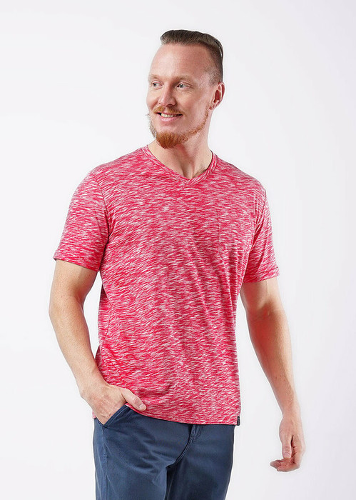 Стильная футболка с V-образным вырезом горловины из дышашего хлопкового полотна (флам). Модель дополняет акцентный карман с принтом и имиджевая фурнитура. Отлично подходит для прогулок и встреч с друзьями.