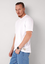 Базовая однотонная футболка стандартного объема с круглой горловиной, втачным рукавом из хлопкового полотна с добавлением эластана. Является неотъемлемой частью мужского гардероба.