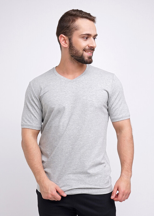 Базовая однотонная футболка стандартного объема с V вырезом горловины, втачным рукавом из хлопкового меланжевого полотна с добавлением эластана. Является неотъемлемой частью мужского гардероба.