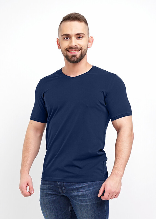 Базовая однотонная футболка стандартного объема с V вырезом горловины, втачным рукавом из хлопкового полотна с добавлением эластана. Является неотъемлемой частью мужского гардероба.