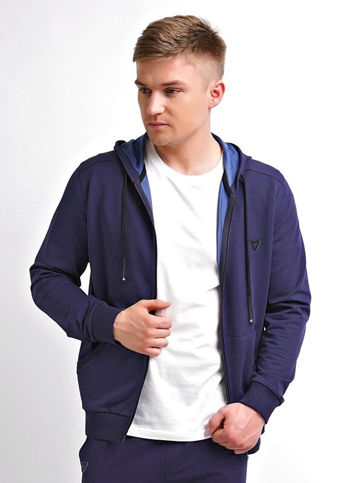 Модная куртка с капюшоном на молнии из плотного трикотажного полотна будет незаменимой вещью в гардеробе любого мужчины, благодаря функциональным карманам "кенгуру" и стильной отделке в виде нашивок.