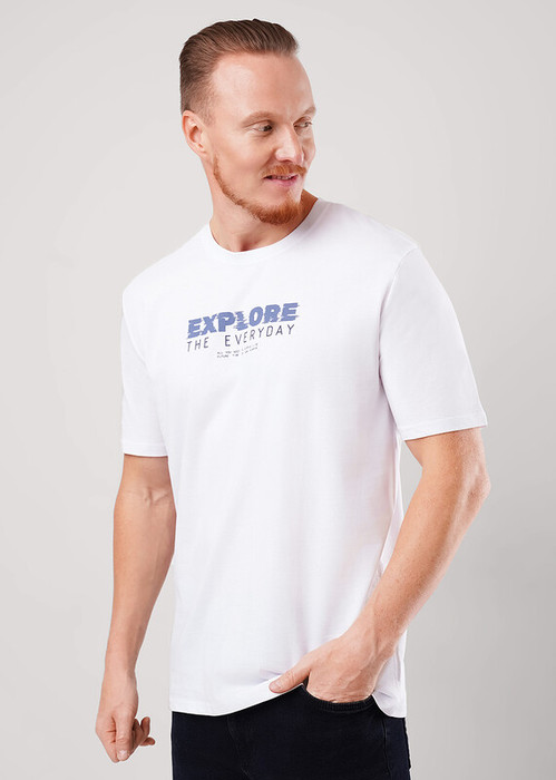 Фуфайка с коротким рукавом среднего объема, с оригинальным принтом, круглым вырезом горловины, которая оформлена обтачкой из рибаны.