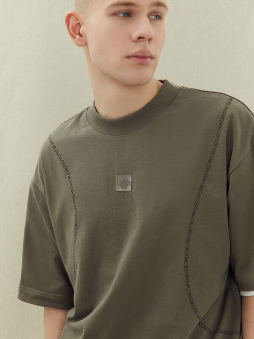 Футболка свободная, оверсайз.Горловина округлой формы обработана обтачкой из рибаны. Шов втачивания обтачки по спинке закрыт тесьмой хб.