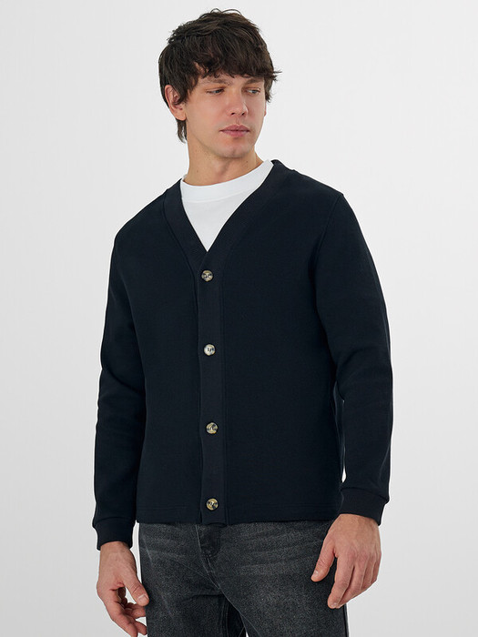 Мужской кардиган станет надежной базой в прохладную погоду. Он выполнен из плотного эластичного трикотажа, который хорошо держит форму и приятен на ощупь. Свободный крой с V-образным вырезом и длинными рукавами создает расслабленный, но аккуратный силуэт.