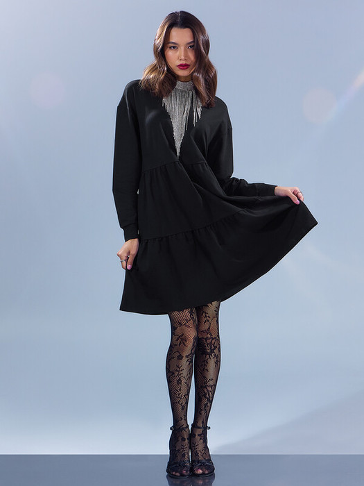 Ультрамодное женское платье А-силуэта из легкого трикотажного футера. Длина мини, выше колена. Вырез классический, круглый, не глубокий. Спущенная линия плеча и углубленные проймы дарят свободу движений. Рукава длинные, на манжетах. Нижняя часть платья состоит из двух ярусов со сборками. Красиво!