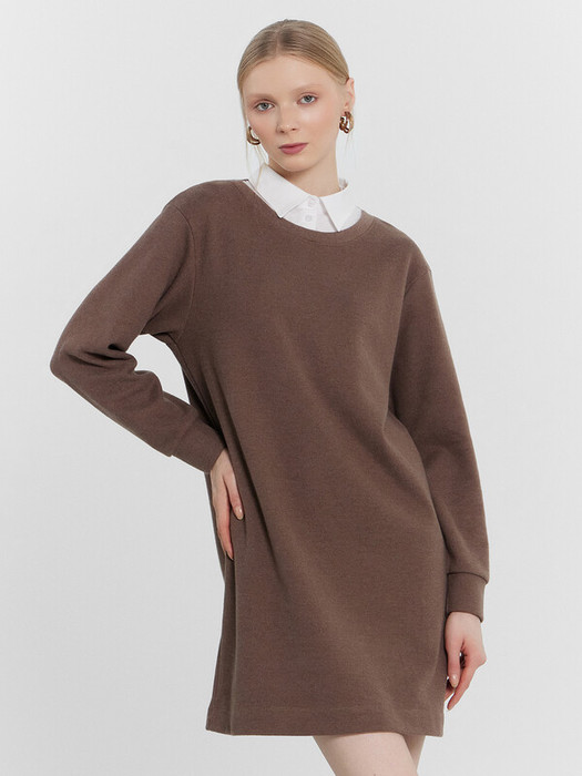 Платье женское прямого силуэта из трикотажного полотна селаник. Горловина круглой формы, с притачным воротником с отрезной стойкой из поплина и застежкой на пуговицу. Плечо слегка спущено, пройма углублена. Рукав втачной, длинный, по низу с отрезной манжетой из селаника. Платье длиной чуть выше колена.