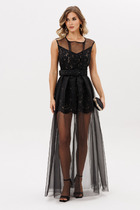 Платье А-силуэта. Горловина круглой формы с воротником стойкой. Плечо слегка спущено, рукав втачной, короткий. На детали переда вытачки. Спинка со средним швом и застежкой на потайную молнию. Нижний срез платья и рукавов обработан швом вподгибку на 2х игольной плоскошовной машине.