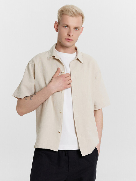 Рубашка прямого силуэта, свободная. Рукава втачные короткие. Воротник отложной с цельнокроеной стойкой. Центральная застежка на петли и пуговицы. Борта с цельнокроеными подбортами. На левой детали переда настрочен накладной карман. Спинка с отрезной кокеткой. По низу боковых швов обработаны разрезы. Нижний срез сорочки и рукавов обработан швом вподгибку с закрытым срезом.