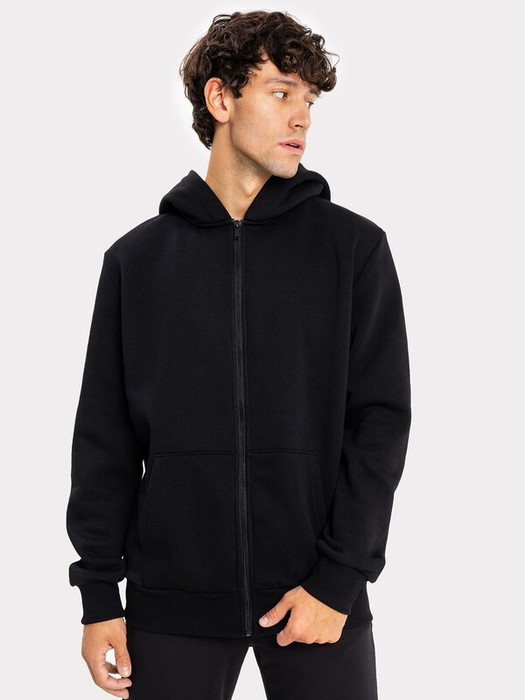 Однотонная мужская толстовка из трикотажного футера с подчесом. Удобный карман-кенгуру, спущенная линия плеча и углубленная пройма, длинные рукава, уютный капюшон, центральная застежка на молнию – ничего лишнего!