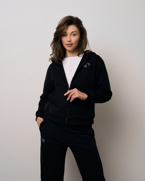 Женская толстовка с двойным капюшоном с застежкой на молнию. По переду накладной карман "кенгуру"