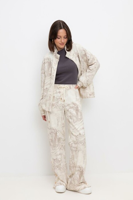Свободные женские брюки с боковыми карманами из мягкого набивного футера двухнитки. Модель с разрезами по низу, застегивающиеся на кнопки. Низ обработан плоскими швами.