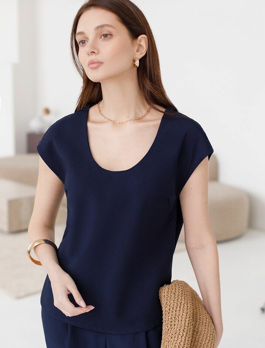 Элегантная блузка темно-синего цвета скроенная по косой выполнена из плотного лиоцелла. Лиоцелл это более дорогой и экологичный вариант вискозы, очень прочный и шелковистый. Эта повседневная блузка с трендовым U-вырезом создана для легкого и утонченного стиля. Мягкие линии кроя создают невероятно эффектный образ, который подчеркивает естественную красоту, не стесняя движений, а свободный фасон дарит ощущение абсолютного комфорта и уверенности. Блузка красиво драпируется при движении, создавая летящий, воздушный эффект. Эта легкая блуза с коротким рукавом идеальный выбор для комфорта и стиля в теплое время года, она будет идеальна для любого повода.