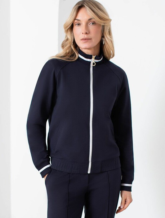 Бомбер темно-синего цвета среднего объема с застежкой на молнию выполнен из премиального футера двухнитки плотностью 240 Г/м2. Натуральный состав ткани обеспечивает дышащий эффект, мягкость и приятные тактильные ощущения, Эластичный материал позволяет свободно двигаться без стеснения, а также отлично сохраняет форму даже после длительного ношения. Гладкая лицевая сторона придает бомберу опрятный и дорогой вид. Повседневный бомбер отличается аккуратным силуэтом без лишнего объема и универсальной длиной, которая идеально подходит для повседневного образа. Манжеты на рукавах и широкая резинка по низу обеспечивают надежную посадку, сохраняя тепло в прохладную летнюю погоду. Особенность бомбера - контрастные полосы на горловине и манжетах, которые добавляют современный акцент и делают его более выразительным. Представленная размерная линейка позволяет подобрать оптимальный вариант для любой фигуры и размера, на маленький или плюс сайз, обеспечивая свободу движений без компромиссов по стилю. Этот легкий бомбер стан
