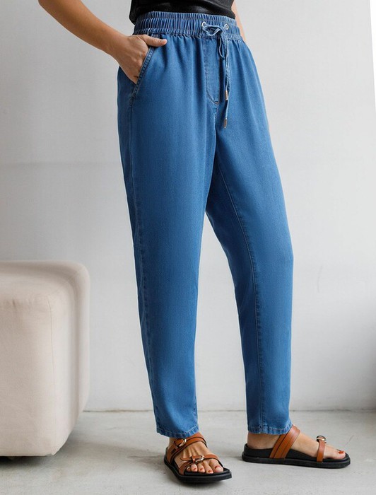 Брюки бананы светло-синего цвета выполнены из легкого джинсового лиоцелла плотностью 7,8 OZ и станут незаменимыми в гардеробе весной и летом. Благодаря свободному крою в области  бедер и слегка заужены к низу, они эффектно смотрятся и обеспечивают максимальный комфорт в течение всего дня. Пояс на резинке аккуратно фиксирует брюки на талии, не сковывая движения, а карманы по бокам добавляют практичности. Стильные бананы удачно скроют недостатки фигуры, подчеркивая достоинства, подойдутна большие размеры. Ткань сочетает прочность и мягкость лиоцелла с вискозой, что делает её невероятно комфортной, дышащей, устойчивой к сминанию и идеально подходящей для чувствительной кожи. Благодаря нежным тактильным ощущениям, будто шелк, от которого ощущается приятная прохлада, штаны отлично подходят для создания легких летних образов или стильных ансамблей на каждый день. Тонкие джинсы можно сочетать в стиле кэжуал, а также создавать монохромные образы или добавлять яркие акценты с помощью аксессуаров.  Эффектный фасон брюк