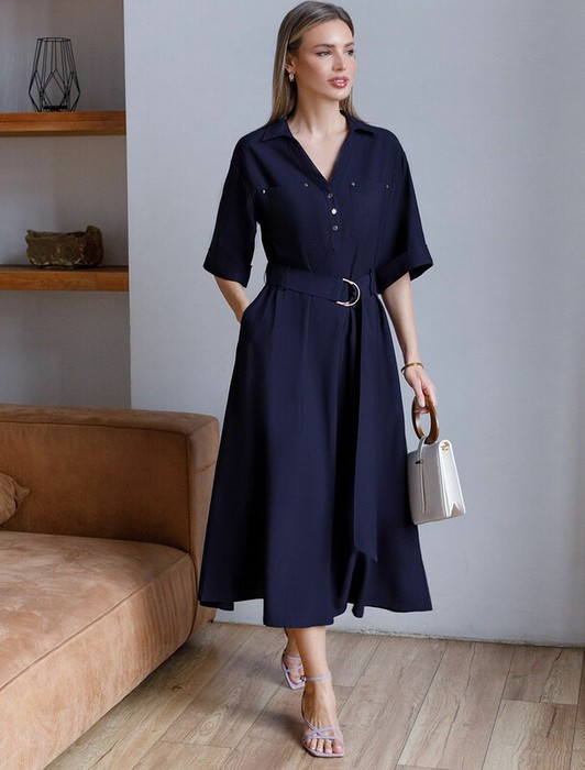 Платье-рубашка темно-синего цвета выполнено из плотного лиоцелла. Лиоцелл это более дорогой и экологичный вариант вискозы, очень прочный и шелковистый. Ткань отличается от регулярной коллекции из лиоцелла - она содержит еще больше лиоцелла (92%), благодаря чему имеет более нежную шелковистую фактуру. Свободное платье трапеция будет идеальным выбором для весны и лета. Отложной воротник добавляет классический акцент, широкий пояс с металлической пряжкой подчеркивает талию, делая силуэт выразительным и женственным. Платье с широким рукавом средней длины смотрится современно, карманы и пуговицы добавляют практичности. Платье А-силуэта идеально сядет и на большие размеры, скроет возможные недостатки и подчеркнет достоинства фигуры за счет элегантного облегания талии и расклешенной юбки. На высокий рост платье будет длины миди, а на низкий рост - длина макси. Такое красивое и комфортное платье подойдет  для повседневных образов, для стилизации в стиле сафари или casual, а так же для торжественных мероприятий.