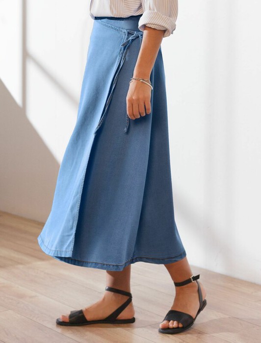 Эффектная юбка миди на запах А-силуэта светло-синего цвета из джинсового лиоцелла плотностью 7,8 OZ станет отличным выбором для тех, кто ценит комфорт и легкость в повседневной одежде. Свободный крой юбки мягко скроет недостатки фигуры, акцентируя внимание на достоинствах и придавая силуэту привлекательность и женственность. ЗапАх гарантирует удобство и возможность регулировки объема талии, а также добавляет современный акцент. Легкая и удобная, она подарит ощущение свободы движений.  Ткань сочетает прочность и мягкость лиоцелла с вискозой, что делает её невероятно комфортной, дышащей, устойчивой к сминанию и идеально подходящей для чувствительной кожи. Юбка отлично подходит для создания легких летних образов или стильных ансамблей на каждый день. Джинсовую юбку можно сочетать в стиле кэжуал, а также создавать романтичные образы или добавлять яркие акценты с помощью аксессуаров. Юбка средней длины гармонично сочетается с разной обувью и верхом, что делает ее отличным выбором для любого случая.