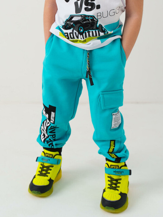 Брюки-джоггеры детские для мальчика. Выполнены из хлопкового трикотажа футер без начеса. Модель прямого кроя со средней посадкой на талии. Пояс выполнен на резинке, дополнительно регулируется шнурком. По бокам — удобные карманы и карман-карго. В нижней части брючин предусмотрены эластичные трикотажные манжеты для лучшей фиксации. Брюки украшены принтами и нашивками.