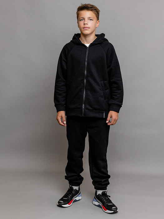 Комплект спортивный из футера с начесом черный для детей: толстовка на молнии и брюки. Ткань не линяет, не выцветает. Толстовка с карманами, глубоким капюшоном и эластичными манжетами рукавов. Брюки с поясом на резинке и утяжке шнурком, карманами и эластичным низом. Удобный базовый комплект одежды. Характеристики:Ткань верха: футер 3-х нитка с начесом65% хлопок, 35% полиэстерПроизводитель: Batik