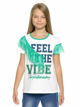 Футболка для девочки c коротким рукавом голубая из кашкорсе. Стильная укороченная футболка с принтом в виде очаровательных котиков. Круглая горловина, низ и рукава с фигурным срезом.Характеристики:Ткань: Кашкорсе 95% хлопок 5% эластанПроизводитель: batik